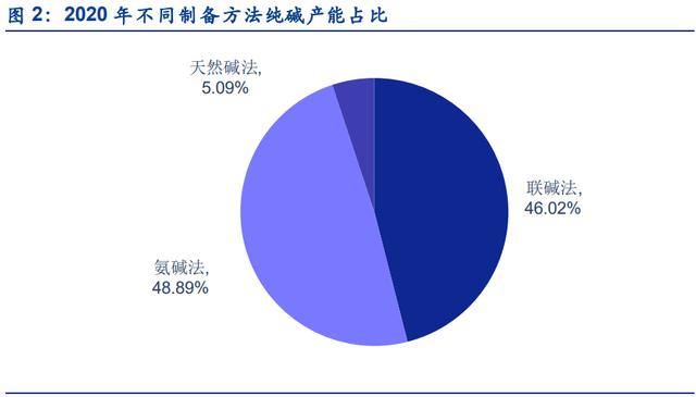 純堿的生產(chǎn)工藝較多,主要可分為天然堿法和合成堿法,其中合成堿法又包括氨堿法和聯(lián)堿法。當前我國純堿產(chǎn)能所使用工藝以氨堿法和聯(lián)堿法為主,二者占比相近,根據百川盈孚, 在我國 2020 年純堿有效產(chǎn)能中,氨堿法、聯(lián)堿法、天然堿法制純堿產(chǎn)能占總產(chǎn)能比例分別 為 48.9%、46.0%、5.09%。