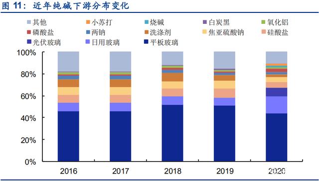 平板玻璃作為純堿的傳統下游,始終是純堿的第一大應用領(lǐng)域。根據百川盈孚,2016-2019 年其在全部下游中占比始終高于 45%,2020 年在光伏玻璃需求的增長(cháng)下占比略降至 44.2%, 但仍為純堿第一大需求領(lǐng)域。