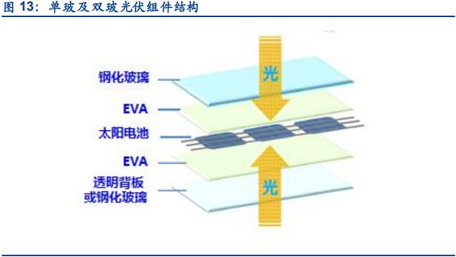 根據所使用光伏玻璃數量的不同,光伏組件又可分為單玻光伏組件和雙玻光伏組件兩類(lèi),其 中雙玻光伏組件就是指由兩片玻璃和太陽(yáng)能電池片組成復合層,電池片之間由導線(xiàn)串、并聯(lián) 匯集到引線(xiàn)端所形成的光伏電池組件。由于早期雙玻組件重量大、不便搬運、功率損失較大, 使用成本更低的有機材料背板的單玻組件一直是市場(chǎng)主流,然而隨著(zhù)近年來(lái)技術(shù)的不斷進(jìn)步, 衰減度更低、耐磨性更強的雙玻光伏組件的普及度逐步提升,滲透率逐年提高。