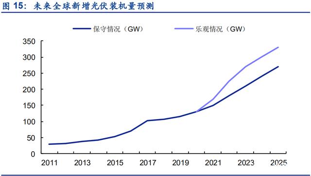 根據光伏行業(yè)協(xié)會(huì )預計,2021 年全球光伏總裝機量將達到 150-170GW,創(chuàng )歷史新高。此外 BNEF、IHS 等機構均預測 2021 年全球光伏裝機規模將超過(guò) 150GW。根據 CPIA 預測,此 后全球新增裝機量將繼續快速上升,到 2025 年有望達到 270-330GW。