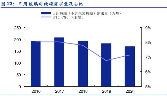 日用玻璃構成了純堿的玻璃需求另一大主要部分,由于百川盈孚所統計的 2020 年日用玻璃 對純堿的需求量中新納入了包裝玻璃需求部分,統計口徑發(fā)生變化,若我們以國家統計局披露的2020 年日用玻璃制品產(chǎn)量及其對純堿的單耗進(jìn)行測算,則 2020 年不含包裝玻璃的日 用玻璃對純堿需求量約為 168.6 萬(wàn)噸,對于我國純堿所將面臨需求同樣有著(zhù)較大影響。