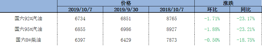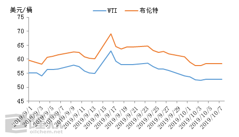 2019年國慶期間,原油價(jià)格呈下跌態(tài)勢,WTI10月1日-7日結算價(jià)均價(jià)52.85美元/桶,環(huán)比上一周期下降5.68%,布倫特同期結算均價(jià)58.20美元/桶,環(huán)比上一周期下降6.40%。