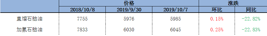 山東地煉方面:2019年國慶期間,山東市場(chǎng)直餾石腦油價(jià)格環(huán)比上漲0.15%,加氫石腦油價(jià)格環(huán)比上漲0.25%。