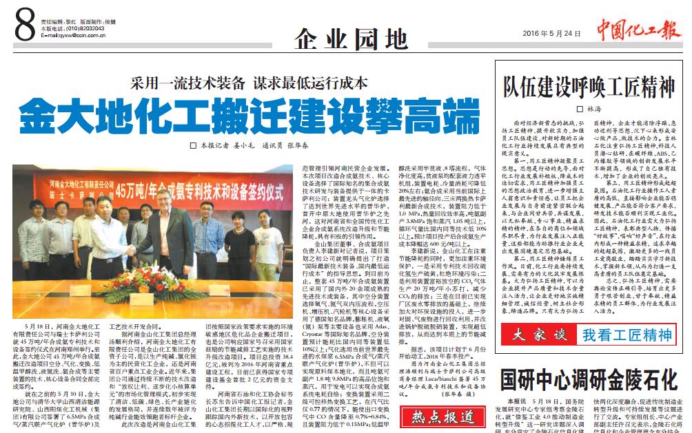 5月18日,河南金大地化工有限責任公司與瑞士卡薩利公司就45萬(wàn)噸/年合成氨專(zhuān)利技術(shù)和設備簽約儀式在河南鄭州舉行。至此,金大地公司45萬(wàn)噸/年合成氨搬遷改造項目空分、氣化、變換、低溫甲醇洗、液氮洗、氨合成等主要裝置的技術(shù)、核心設備合同全部完成簽約。