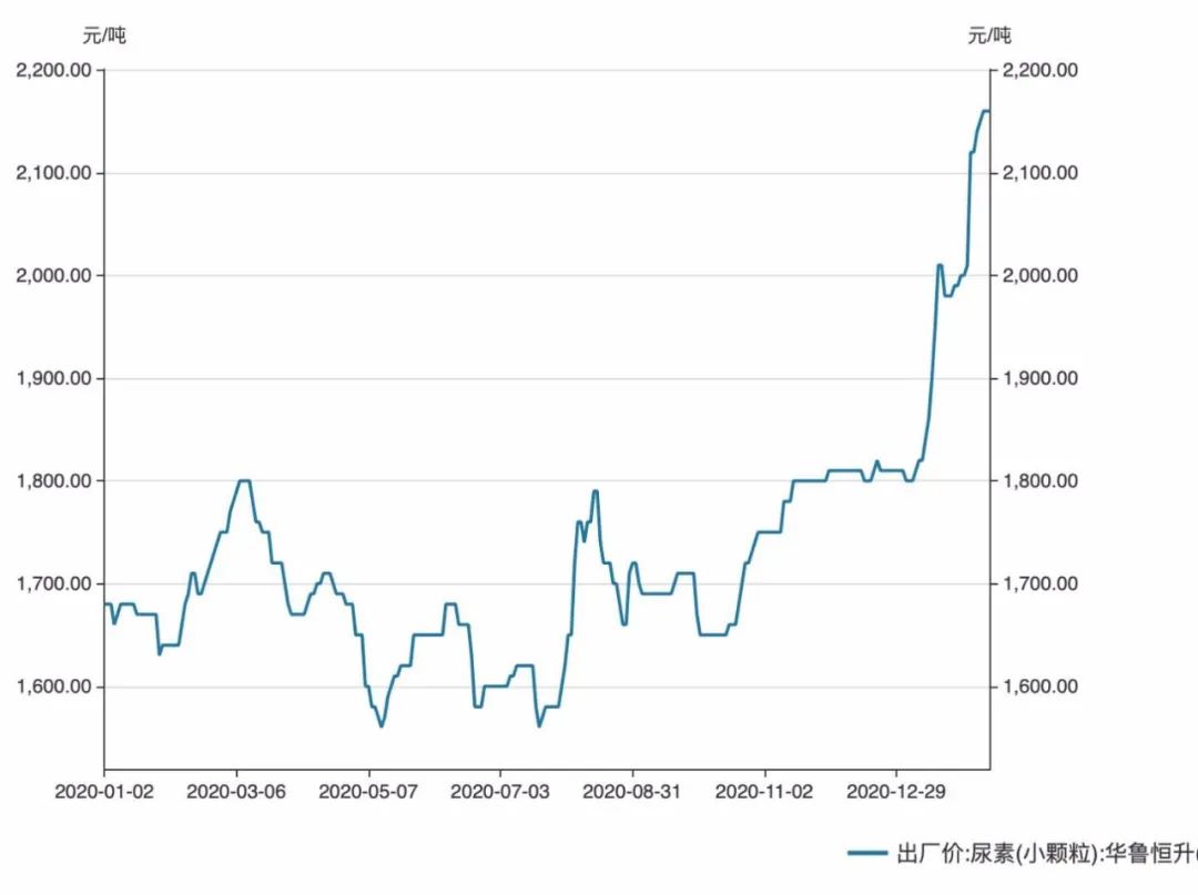氮肥方面,截至2月10日,年初至今主流尿素報價(jià)已累計上漲至少15%。以華魯恒升的報價(jià)為例,10日尿素出廠(chǎng)價(jià)為2160元/噸,年初至今累計上漲20%,創(chuàng )兩年多新高。