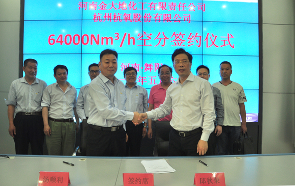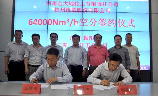 2016年5月6日下午5點(diǎn),河南金大地公司與杭州杭氧股份有限公司就45萬(wàn)噸合成氨系統搬遷改造項目64000nm³/h空分制作項目成功簽約,打響了金大地技改項目建設的第一槍。