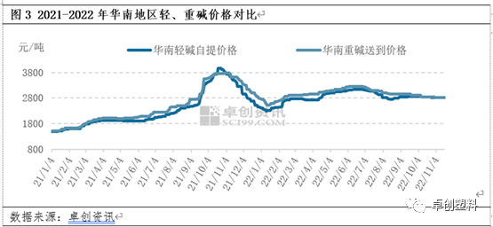 進(jìn)入11月份之后,隨著(zhù)輕堿價(jià)格的下滑及重堿市場(chǎng)成交重心的抬升,輕、重堿價(jià)格倒掛現象有所緩解,華中地區輕重堿價(jià)差再次呈現了擴大的趨勢。月內湖北雙環(huán)產(chǎn)量下降,中源化學(xué)檢修影響部分重堿產(chǎn)量,河南駿化停車(chē)檢修,華中地區市場(chǎng)貨源供應量減少,適逢重堿下游玻璃廠(chǎng)家剛需補貨,廠(chǎng)家重堿庫存降至低位,穩價(jià)意向增加,市場(chǎng)價(jià)格變動(dòng)不大;輕堿下游需求低迷,焦亞、泡花堿等行業(yè)虧損,純堿廠(chǎng)家輕堿接單速度放緩,月內新單價(jià)格下滑20-50元/噸。截至11月18日,華中地區輕堿主流出廠(chǎng)價(jià)格在2500-2680元/噸,重堿主流終端價(jià)格在2700-2750元/噸,輕、重堿主流終端價(jià)格相差不大。