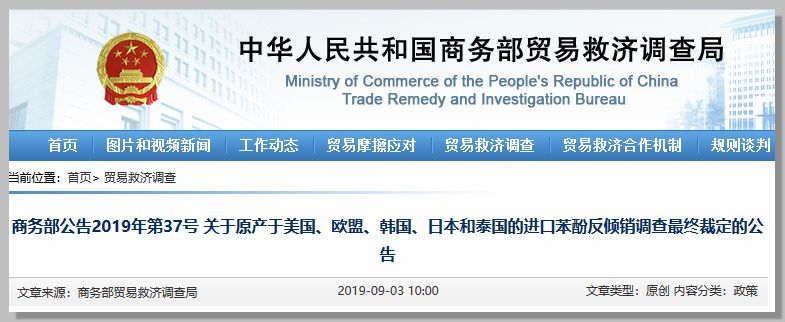 2019年5月27日,調查機關(guān)發(fā)布初裁公告,初步認定原產(chǎn)于美國、歐盟、韓國、日本和泰國的進(jìn)口苯酚存在傾銷(xiāo),國內苯酚產(chǎn)業(yè)受到實(shí)質(zhì)損害,而且傾銷(xiāo)與實(shí)質(zhì)損害之間存在因果關(guān)系。并開(kāi)始實(shí)施臨時(shí)反傾銷(xiāo)措施。