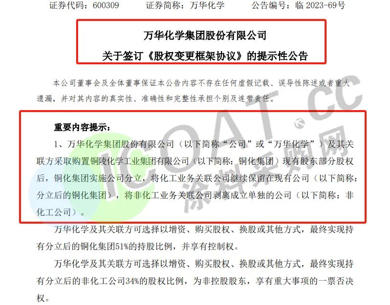 萬(wàn)華化學(xué)擬通過(guò)股權轉讓、增資等方式,實(shí)現萬(wàn)華化學(xué)及其關(guān)聯(lián)方持有銅化集團化工業(yè)務(wù)51%的股權,同時(shí)持有非化工業(yè)務(wù)34%的股權。銅化集團為六國化工和安納達兩家上市公司的控股股東,分別持有二者25.49%和30%股份。