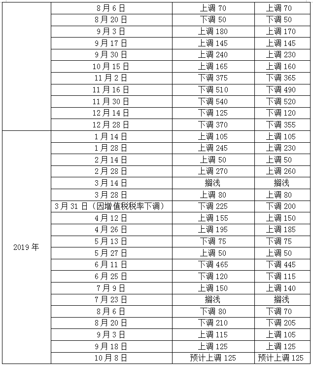 據測算,截至9月27日原油綜合變化率為2.44%,對應上調幅度為105元/噸。目前為調價(jià)周期的第八個(gè)工作日,上調已是板上釘釘。本次調價(jià)過(guò)后,2019年的調價(jià)格局將變?yōu)?ldquo;十二漲六跌兩擱淺”。(含3月31日因增值稅稅率調整而進(jìn)行的下調)