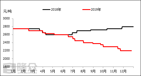圖3 2018-2019年國際磷酸二銨價(jià)格走勢圖