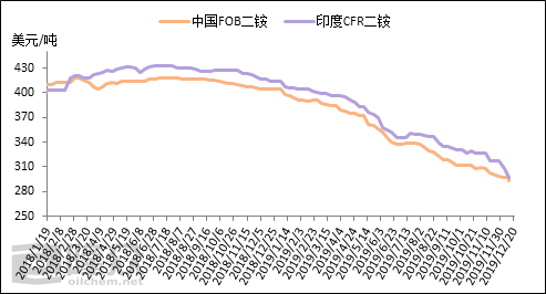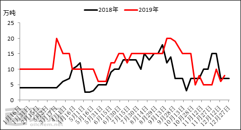 進(jìn)入2019年下半年鎮江港港口庫存數據由高走低,最高至20萬(wàn)噸,最低至4萬(wàn)噸。截止12月20日,磷酸二銨國內主要港口庫存量約22.1萬(wàn)噸,較上周減少5.6萬(wàn)噸。其中鎮江港減少4萬(wàn)噸至4萬(wàn)噸,防城港減少0.5萬(wàn)噸,北海港減少1.1萬(wàn)噸,其他港口暫無(wú)變化。主因國際主要進(jìn)口國庫存高位,進(jìn)口需求差,加上中國港口離岸價(jià)不斷走低,企業(yè)出口積極性欠佳,企業(yè)重心轉向冬儲市場(chǎng),致使港口庫存走低。