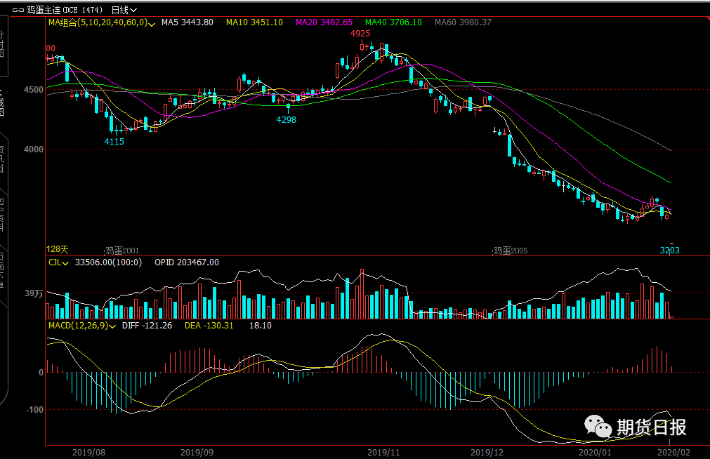 受疫情以及全球恐慌情緒影響,昨日國內期貨市場(chǎng)全線(xiàn)飄綠,農產(chǎn)品普跌,雞蛋全合約走低,JD2002、JD2003、JD2004、JD2005、JD2006、JD2007六個(gè)合約均以跌停收盤(pán),其中主力合約JD2005直接以跌停價(jià)3203元/500kg開(kāi)盤(pán),直至收盤(pán)。