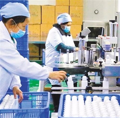 212日,江西省樟樹(shù)市正康醫藥公司員工在酒精罐裝線(xiàn)忙生產(chǎn)。公司在政府幫扶下解決了原料短缺困難,有力保障了抗疫物資供應。陳晗攝(中經(jīng)視覺(jué))