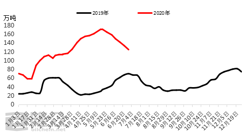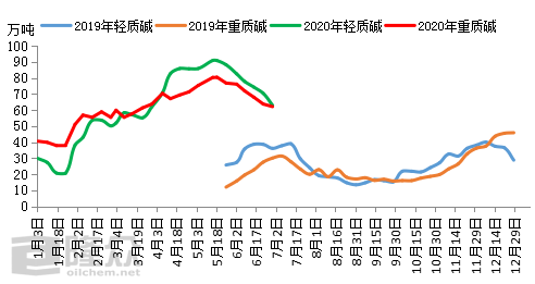 隆眾資訊統計,2020年上半年純堿庫存先增后降,庫存創(chuàng )新高,最高庫存171.19萬(wàn)噸,其中輕質(zhì)純堿90.78萬(wàn)噸,重質(zhì)純堿80.29萬(wàn)噸。一方面,下游需求受疫情影響,裝置開(kāi)工率和成品銷(xiāo)售受阻,純堿消耗量下降,采購謹慎,純堿庫存集中于廠(chǎng)家;另一方面,純堿價(jià)格持續下跌,買(mǎi)漲不買(mǎi)跌的心態(tài)下,下游保持觀(guān)望。此外,前期企業(yè)裝置開(kāi)工率高,檢修和減量企業(yè)少,產(chǎn)量大,企業(yè)庫存持續增加。進(jìn)入5月份以后,隨著(zhù)檢修企業(yè)的增加,開(kāi)工率下降,產(chǎn)量減少,價(jià)格下探空間有限,部分企業(yè)庫存消化。5月下旬庫存出現轉折,庫存持續下降。其一,純堿企業(yè)的集中檢修;其二,企業(yè)止跌共識,部分企業(yè)報價(jià)上調;其三,下游低價(jià)補庫。