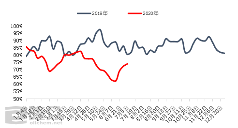 隆眾資訊統計,2020年上半年純堿整體產(chǎn)量1365.44萬(wàn)噸,2019年產(chǎn)量1400.32萬(wàn)噸,同比減少34.88萬(wàn)噸,下降2.49%。2020年上半年純堿整體開(kāi)工率72.99%,2019年開(kāi)工率84.57%,同比下降11.58%,主要原因在于部分企業(yè)減量生產(chǎn),裝置檢修,另外部分裝置長(cháng)期停車(chē),當前包含甘肅金昌、湖南湘潭、江蘇中海華邦、江蘇德邦、遼寧大化、內蒙古蘇尼特。
