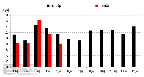 隆眾資訊統計,2020年1-5月份,國內純堿進(jìn)口量20.01萬(wàn)噸,去年同期0.41萬(wàn)噸,進(jìn)口量同比增加;出口量53.08萬(wàn)噸,去年同期60.19萬(wàn)噸,同比減少。主要原因在于今年受疫情影響,出口受阻。當前國內基本復產(chǎn)復工,與其他主要純堿消費體相比,中國的國內純堿市場(chǎng)仍屬于優(yōu)質(zhì)市場(chǎng),國內純堿消費大國,國外形勢局面緊張,導致輸出到中國的量在增加。