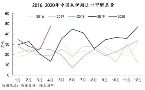 隆眾資訊的數據顯示,截止到2020年4月,伊朗甲醇產(chǎn)能約在1221萬(wàn)噸/年,占全球產(chǎn)能的21%,是僅次于中國的全球第二大甲醇生產(chǎn)國。而伊朗甲醇主要用于出口,中國和印度是主要買(mǎi)家,其中中國購買(mǎi)量占到伊朗出口量的65%左右。中國甲醇最大需求在甲醇制烯烴,而印度甲醇需求多在傳統下游。受原油下跌和海外疫情的影響,二季度海外傳統下游需求低迷。中國市場(chǎng)需求規模大且較為穩定,伊朗貨主更愿意將貨發(fā)往中國,以獲得更高的利潤回報。目前來(lái)看,外盤(pán)裝置運行暫處于穩定狀態(tài),除南美地區部分裝置以外,未有其他由于成本問(wèn)題停車(chē)或者降幅,海外甲醇供應壓力亦較為明顯。