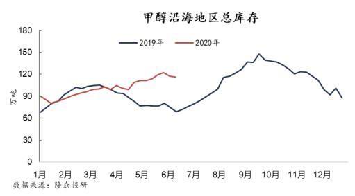 由于液體化工庫容有限,港口出現脹庫,船貨抵港卸貨速度十分緩慢。特別是5月中旬以來(lái),持續增加的到船數量,使得港口庫區罐容事態(tài)繼續擴大化,為避免甲醇流動(dòng)性持續減弱,月中開(kāi)始部分庫區陸續出臺倉儲費新標準,超期貨物的倉儲費用變?yōu)樵瓉?lái)的數倍,這無(wú)疑增加了庫區的提貨量,但市場(chǎng)需求相對穩定,反而使得市場(chǎng)拋售風(fēng)險上升。截至6月中旬,沿海港口甲醇庫存在128萬(wàn)噸,創(chuàng )年內新高的同時(shí),也刷新了歷史同期最高。由于目前港口一罐難求狀態(tài)未有緩解,市場(chǎng)心態(tài)以及情緒影響較大,但目前外盤(pán)裝置運行暫處于穩定狀態(tài),后期進(jìn)口量仍將持續到港,港口高庫存問(wèn)題短期難以緩解。