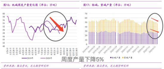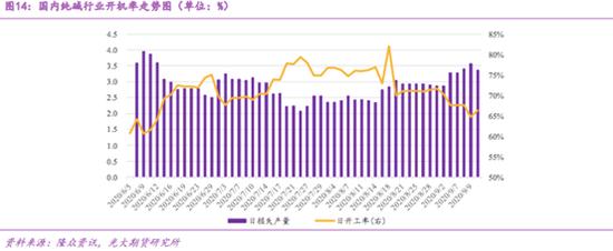 供應方面,進(jìn)入9月以來(lái)純堿企業(yè)裝置意外不斷。本周南方堿業(yè)、江蘇井神等企業(yè)停車(chē)拖動(dòng)純堿行業(yè)日開(kāi)機率降至64.74%,日損失量也一度達到3.57萬(wàn)噸。但隨著(zhù)江蘇實(shí)聯(lián)、陜西興化等企業(yè)復產(chǎn)并逐步出產(chǎn)品,開(kāi)機率周末有所回升。但目前純堿行業(yè)整體開(kāi)機率仍維持在67.24%的低位水平,同比降低23.92個(gè)百分點(diǎn)。預計純堿供應水平短時(shí)間內難以快速恢復,供給縮減將給純堿企業(yè)提價(jià)心態(tài)帶來(lái)有效支撐。