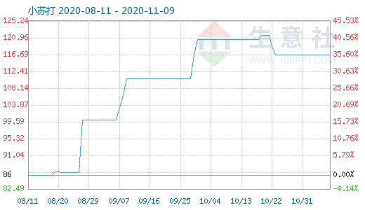 據生意社監測數據顯示,國內小蘇打價(jià)格下滑。11月9日國內市場(chǎng)均價(jià)為1690元/噸,11月8日國內市場(chǎng)均價(jià)為1656.67元/噸,價(jià)格下調3.8%。11月8日小蘇打商品指數為116.59,與昨日持平,較周期內最高點(diǎn)121.68點(diǎn)(2020-10-21)下降了4.18%,較2020年09月06日最低點(diǎn)100.00點(diǎn)上漲了16.59%。(注:周期指2020-09-01至今)