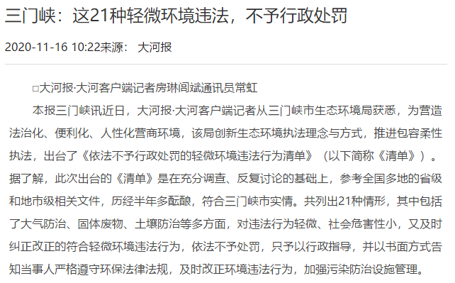 日前,河南省三門(mén)峽市生態(tài)環(huán)境局發(fā)布《依法不予行政處罰的輕微環(huán)境違法行為清單》,包括了大氣防治、固體廢物、土壤防治等多方面,對違法行為輕微、社會(huì )危害性小,又及時(shí)糾正改正的符合輕微環(huán)境違法行為,依法不予處罰,只予以行政指導,并以書(shū)面方式告知當事人嚴格遵守環(huán)保法律法規,及時(shí)改正環(huán)境違法行為,加強污染防治設施管理。