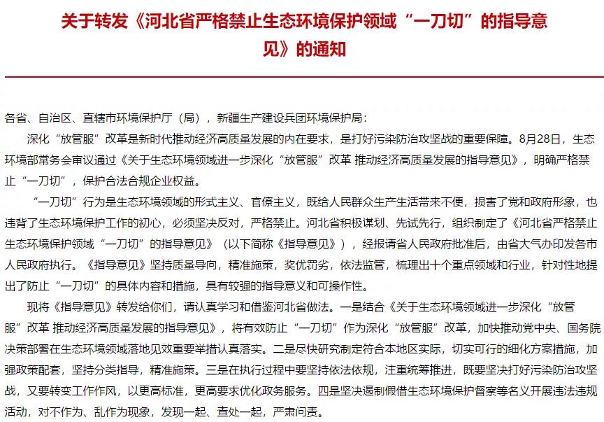 早在2018年,河北省就發(fā)布了《嚴格禁止生態(tài)環(huán)境保護領(lǐng)域“一刀切”的指導意見(jiàn)》的通知,將有效防止“一刀切”作為深化“放管服”改革,加快推動(dòng)黨中央、國務(wù)院決策部署在生態(tài)環(huán)境領(lǐng)域落地見(jiàn)效重要舉措認真落實(shí)。二是盡快研究制定符合本地區實(shí)際,切實(shí)可行的細化方案措施,加強政策配套,堅持分類(lèi)指導,精準施策。三是在執行過(guò)程中要堅持依法依規,注重統籌推進(jìn),既要堅決打好污染防治攻堅戰,又要轉變工作作風(fēng),以更高標準,更高要求優(yōu)化政務(wù)服務(wù)。四是堅決遏制假借生態(tài)環(huán)境保護督察等名義開(kāi)展違法違規活動(dòng),對不作為、亂作為現象,發(fā)現一起、查處一起,嚴肅問(wèn)責。